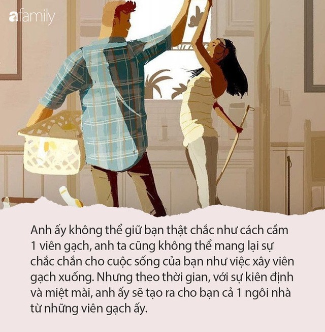 Có đôi khi, người đàn ông ở 1 giai đoạn nào đó làm việc chăm chỉ như 1 người thợ xây. Anh ấy không thể giữ bạn thật chắc như cách cầm 1 viên gạch, anh ta cũng không thể mang lại sự chắc chắn cho cuộc sống của bạn như việc xây viên gạch xuống. Nhưng theo thời gian, với sự kiên định và miệt mài, anh ấy sẽ tạo ra cho bạn cả 1 ngôi nhà từ những viên gạch ấy.