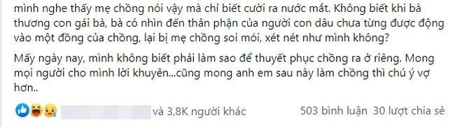Trong nhà, tiền bạc chồng mình kiếm ra, mẹ chồng mình quản lý hết. Bản thân mình không được động đến một đồng nào. Mỗi tháng, mình cũng phải đóng thêm 2 triệu tiền ăn nữa. Mỗi lần, mình muốn mua gì cho bản thân thì mình đều phải tự bỏ tiền ra hoặc mẹ mình dấm dúi cho con gái. Tủi thân, tủi phận, lần nào về thăm mẹ mình cũng ôm mẹ khóc.