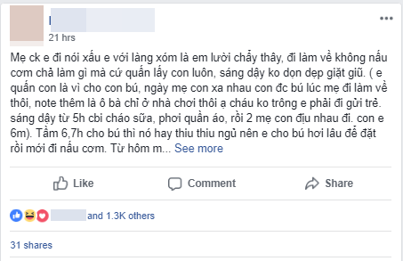 "Mẹ chồng em đi nói xấu em với làng xóm là em lười chảy thây, đi làm về không nấu cơm chả làm gì mà cứ quấn lấy con luôn, sáng dậy không dọn dẹp giặt giũ. (Em quấn con là vì cho con bú, ngày mẹ con xa nhau con được bú lúc mẹ đi làm về thôi, note thêm là ông bà chỉ ở nhà chơi thôi ạ. Cháu không trông em phải đi gửi trẻ. Sáng dậy từ 5h chuẩn bị cháo sữa, phơi quần áo, rồi 2 mẹ con địu nhau đi. Con em 6 tháng). Tầm 6 - 7h cho bú thì nó hay thiu thiu ngủ nên em cho bú hơi lâu để đặt rồi mới đi nấu cơm.