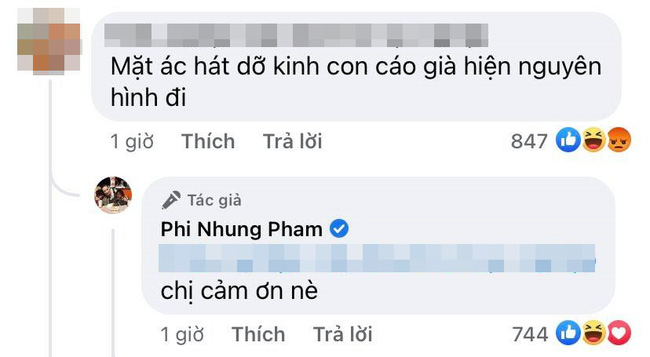 Tuy nhiên, Phi Nhung lại bất ngờ bị một antifan để lại bình luận công kích: "Mặt ác, hát dở, con cáo già hiện nguyên hình đi". Và điều bất ngờ hơn là phản ứng của Phi Nhung trước bình luận mỉa mai này. Thay vì đáp trả gay gắt để bảo vệ bản thân, Phi Nhung lại viết: "Chị cảm ơn nè". Hành động của Phi Nhung khiến dân tình vô cùng khó hiểu.