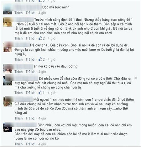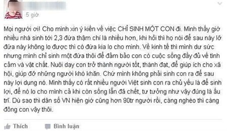 Chia sẻ mới đây của một bà mẹ trẻ có facebook tên D.T.Đ về chuyện chỉ sinh một con để đảm bảo cho con có cuộc sống đầy đủ và cho rằng nhiều mẹ Việt khác sinh nhiều con “chủ yếu là để sinh lợi”, “lợi dụng con”, bị hội chị em phụ nữ “ném đá” rầm rầm vì giống như đang xúc phạm tới chính mình.
