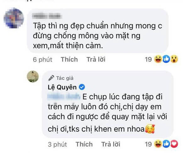 Ngay lập tức, nữ ca sĩ đáp trả ở dưới phần bình luận: "Em chụp lúc đang tập đi trên máy luôn đó chị, chị dạy em cách đi ngược để quay mặt lại với chị ơi, cảm ơn chị khen em nha". Cô không hề tỏ ra khó chịu hay hậm hực mà thậm chí còn nhẹ nhàng cảm ơn ý kiến nhận xét của dân mạng. Lý lẽ mà cô đưa ra cũng khó có thể chối cãi, chính cách trả lời khéo léo, thuyết phục của Lệ Quyên đã khiến người này e ngại, xoá đi comment chỉ sau ít phút.
