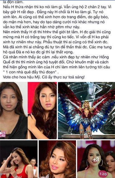 Sau khi dành một số lời khen cho Phạm Hương như “nụ cười rạng rỡ, thần thái tốt, body đẹp, bản lĩnh, khôn ngoan,…”, tài khoản này tiếp túc “mổ xẻ” nhan sắc “Hoa hậu hoàn vũ Việt Nam 2015”. “5 năm để em chinh chiến các cuộc thi và đạt độ chín như bây giờ. Nhưng cũng không thể biến một người từ cằm một mẩu và chẻ đôi ở giữa thành chiếc cằm v-line như bây giờ. Chưa kể mũi thấp thành cao. Và trước kia đi Next Top Hương còn gầy hơn bây giờ. Tạng mặt Hương to, cằm 2 ngấn, mặt to nhiều thịt. Thật sự so với bây giờ là một bộ mặt hoàn toàn khác, từ cái điệu mồm khi nói khi cười khác 100%” – tài khoản này bình luận về nhan sắc Phạm Hương khi còn tham gia Next Top Model.