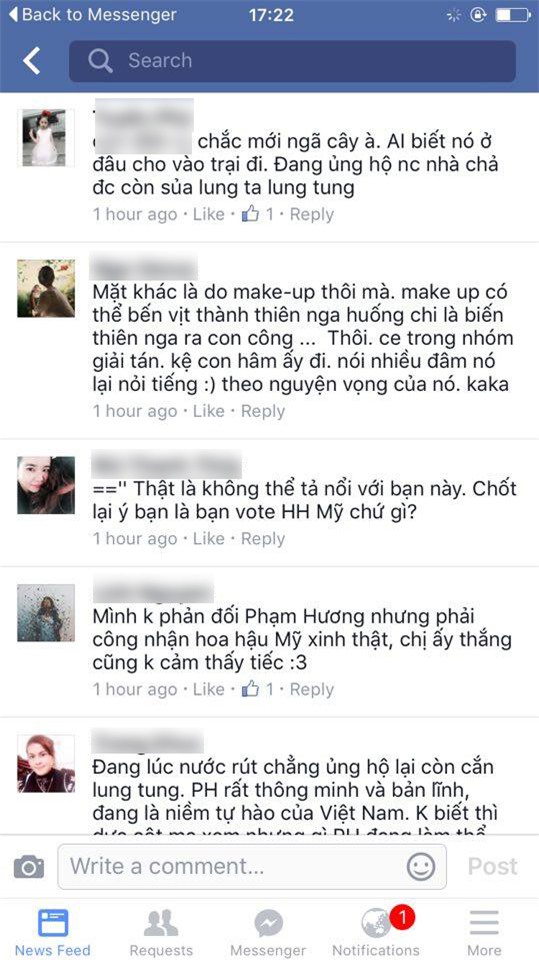 Topic sau khi được đăng tải đã thu hút hàng trăm bình luận từ các người dùng facebook khác. Tất cả đều đồng loạt phản bác ý kiến của chủ nhân topic này. Họ cho rằng, việc phẫu thuật thẩm mĩ là quyền tự do của mỗi người nếu bạn muốn đẹp. Hơn nữa, không phải ai phẫu thuật xong cũng đều đẹp hoàn hảo nên khi Phạm Hương sở hữu nhan sắc mặn mà, sắc sảo như hiện tại là điều đáng mừng. Ngoài ra, một bộ phận lớn các bình luận khác lại cho rằng, hiện tại, Phạm Hương đang bước vào chặng đường cuối của “Hoa hậu hoàn vũ 2015”, vì thế, là người dân cùng một nước, tất cả mọi người nên tạo thêm động lực cho cô ấy hơn là việc tìm ra khuyết điểm khiến cô bị mất tinh thần.
