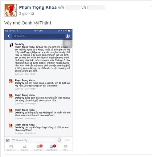 Mới đây, MC Anh Khoa tiếp tục đăng dòng trạng thái nhằm tố Vy Oanh cố tình dọa dẫm anh trên facebook. MC Anh Khoa cho biết, Vy Oanh đã từng nhắn tin xin show từ anh. Ngay sau đó, nữ ca sĩ "Đồng xanh" không hề lo lắng, sợ hãi mà tiếp tục để lại những bình luận khác có tính khiêu khích.