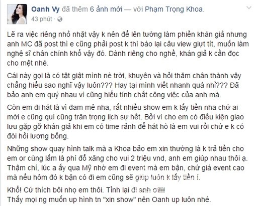 Không dừng lại ở đó, Vy Oanh cũng chia sẻ một dòng trạng thái với ngôn từ khá "dịu dàng" nhưng dứt khoát, mạnh mẽ, thể hiện thái độ đanh thép của cô trước lời tố của MC Anh Khoa. Vy Oanh khẳng định đàn anh "có tật giật mình" bởi cô "khuyên và hỏi thăm chân thành" lại hiểu lầm thành lời hăm dọa. Nữ ca sĩ một lần nữa khẳng định bản thân đi hát vì đam mê, để có điều kiện giao lưu gặp gỡ khán giả. Nhiều show cô nhận mà không hề lấy tiền vì quý trọng mối quan hệ với người mời. Bên cạnh đó, Vy Oanh "thẳng thắn" tung những hình ảnh chụp lại từ đoạn hội thoại của cô và MC Anh Khoa cách đây khá lâu để chứng minh cô không xin show như đàn anh đã nói. Tất cả chỉ là sự hỗ trợ nhau, "có qua có lại" giữa hai người đồng nghiệp.