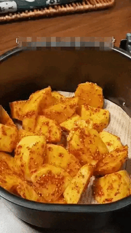 Bạn làm nóng nồi chiên không dầu ở mức nhiệt 200 độ trong 5 phút. Sau đó, lót 1 lớp giấy nến hoặc giấy bạc vào lòng nồi chiên trước cho phần khoai tây đã ướp gia vị vào. Bạn chiên khoai tây 2 lần. Lần 1 chọn mức nhiệt 200 độ trong 10 phút, lần 2 chọn mức nhiệt 150-170 độ trong 5 phút.