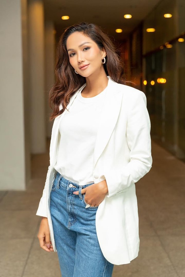 H'Hen Niê thanh lịch khi phối áo thun trắng, quần jeans với blazer trắng.