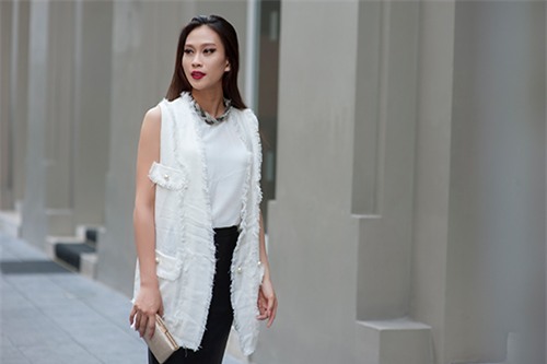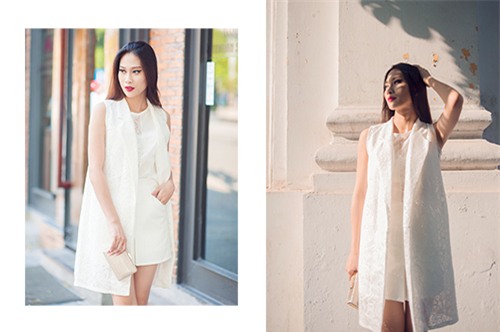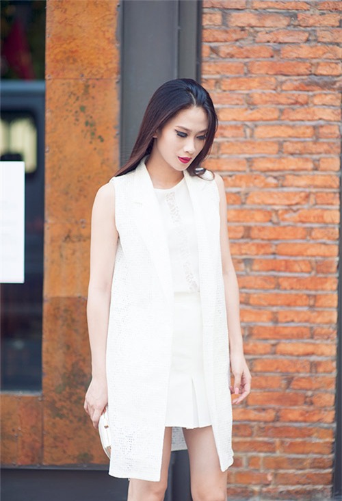 Chiếc áo vest dáng dài với tay trần và cả cây trắng đem đến hình ảnh thanh nhã mà sành điệu cho nàng công sở trong những ngày cuối Thu.