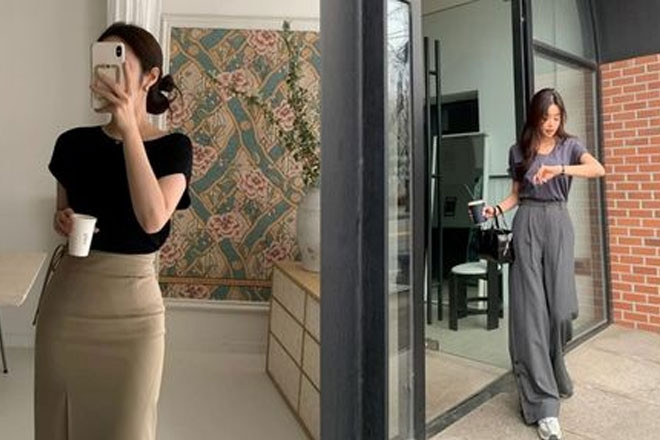 Áo thun ôm body phối cùng quần tây là một bộ đôi đơn giản nhưng cực kỳ hiệu quả cho phong cách thanh lịch và hiện đại.