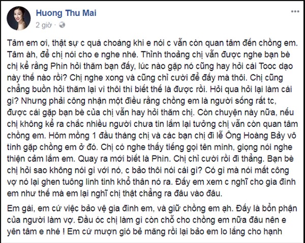 Mở đầu tâm thư, Maya làm rõ mối quan hệ giữa cô và chồng Tâm Tít ở thời điểm hiện tại. Giọng ca Xin đừng quay bước khẳng định chồng đàn em là một người sống "tình cảm", thi thoảng vẫn hỏi thăm cô thông qua bạn bè.