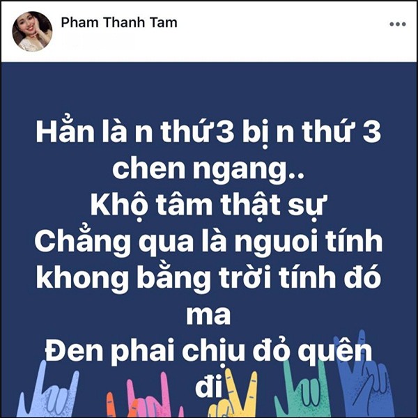 Chuyện sẽ chẳng có gì đáng nói thêm nếu như Tâm Tít - hot girl đình đám một thời - không đăng đàn hàm ý mỉa mai về những phát ngôn của Maya. "Hẳn là người thứ 3 bị người thứ 3 chen ngang. Khổ tâm thật sự. Chẳng qua người tính không bằng trời tính đó mà, đen phải chịu, đỏ quên đi", cô viết.