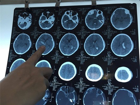 Thanh sắt xuyên qua sọ, qua các tổ chức não đến tận não thất làm chảy máu não thất. Vị trí đâm xuyên này rất nguy hiểm nên tình trạng của em là rất nặng. Hiện cháu vẫn nằm trong phòng hồi sức, vẫn thở máy và hôn mê sâu. Nếu mà cháu qua được giai đoạn nguy hiểm này thì câu chuyện về sau còn rất nan giải và gia đình phải xác định sẽ chữa trị cho cháu rất lâu dài nên chi phí vô cùng tốn kém”.