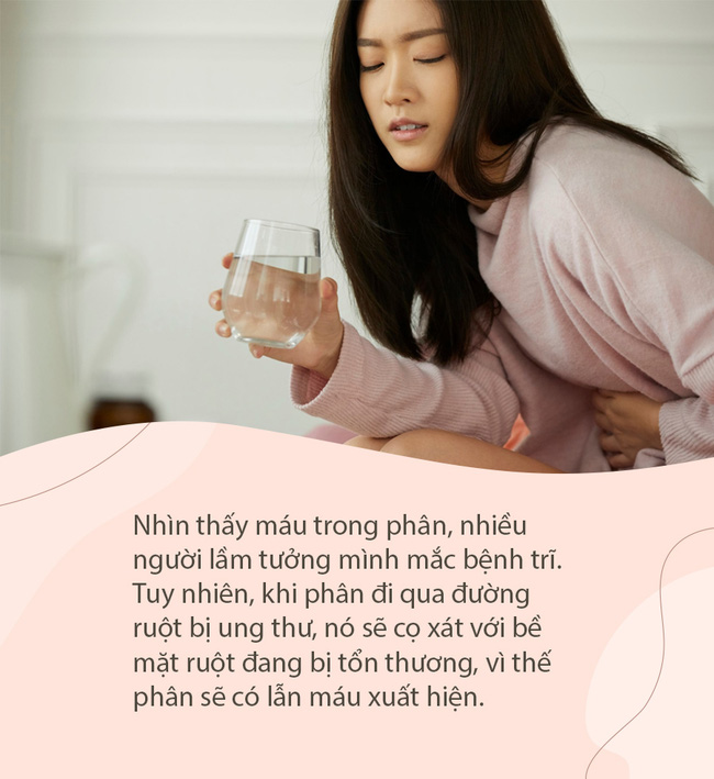 Nhìn thấy máu trong phân, nhiều người lầm tưởng mình mắc bệnh trĩ. Tuy nhiên, khi phân đi qua đường ruột bị ung thư, nó sẽ cọ xát với bề mặt đang bị tổn thương, vì thế phân sẽ có lẫn máu xuất hiện.