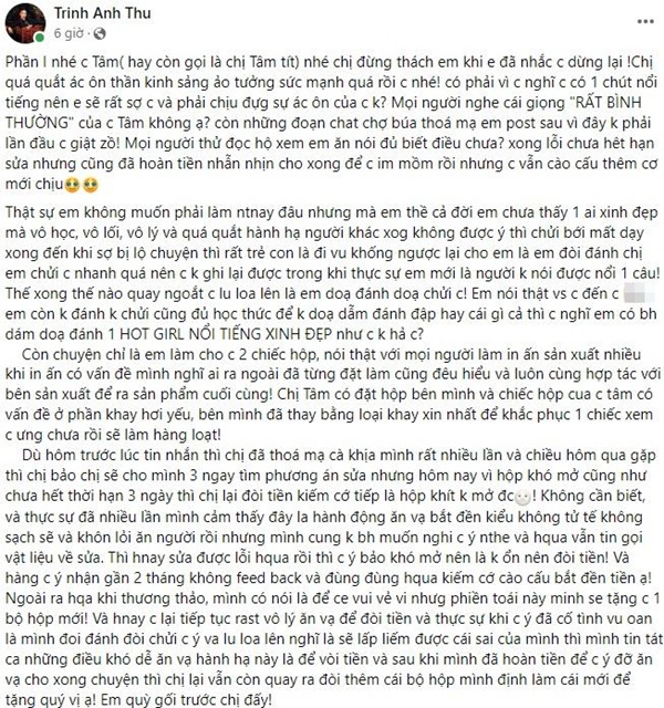 Anh Thư nói thêm, sau khi phía Tâm Tít biết được bài bóc phốt của cô trên Facebook vẫn tiếp tục nhắn tin thách thức, cà khịa. "Chị ấy vẫn tiếp tục thách thức. Tôi đã cố gắng bình tĩnh lắm rồi nhưng chị ấy như bị điên.