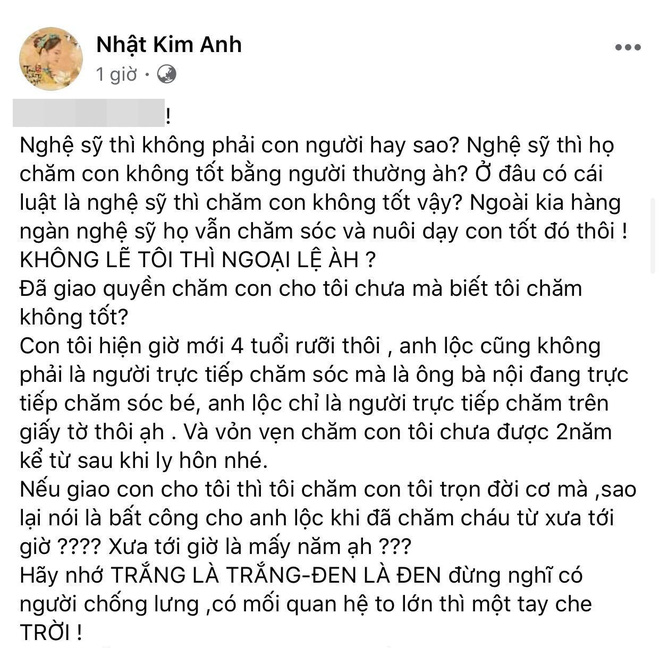 Trước lập luận này, Nhật Kim Anh một lần nữa bày tỏ sự bức xúc trên trang cá nhân. Cô bác bỏ ý kiến cho rằng là nghệ sĩ thì không thể chăm sóc con cái tốt, đồng thời tố cáo chồng cũ cũng không phải là người trực tiếp chăm sóc bé Tin mà do ông bà nội, thời gian đó cũng chỉ vỏn vẹn 2 năm sau khi ly hôn chứ không phải từ khi bé ra đời.