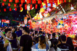 Phố Hàng Mã rực rỡ sắc màu với đủ loại đèn lồng, mặt nạ và phụ kiện vui chơi Trung thu kết hợp giữa truyền thống và hiện đại, thu hút đông đảo người dân.