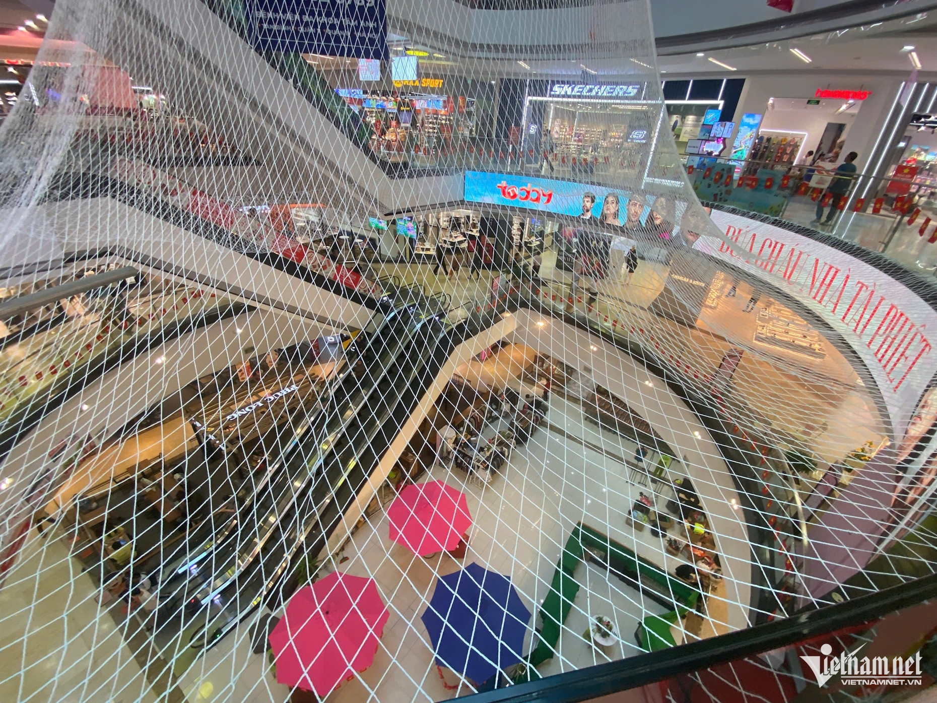 Theo đó, khu vực 2 khoảng không thông tầng (hay còn gọi là giếng trời lấy sáng tự nhiên) hình nón cụt của Vạn Hạnh Mall đã được giăng kín bằng lưới rào chắn, với phần đáy được siết chặt vào tường ở tầng 1.