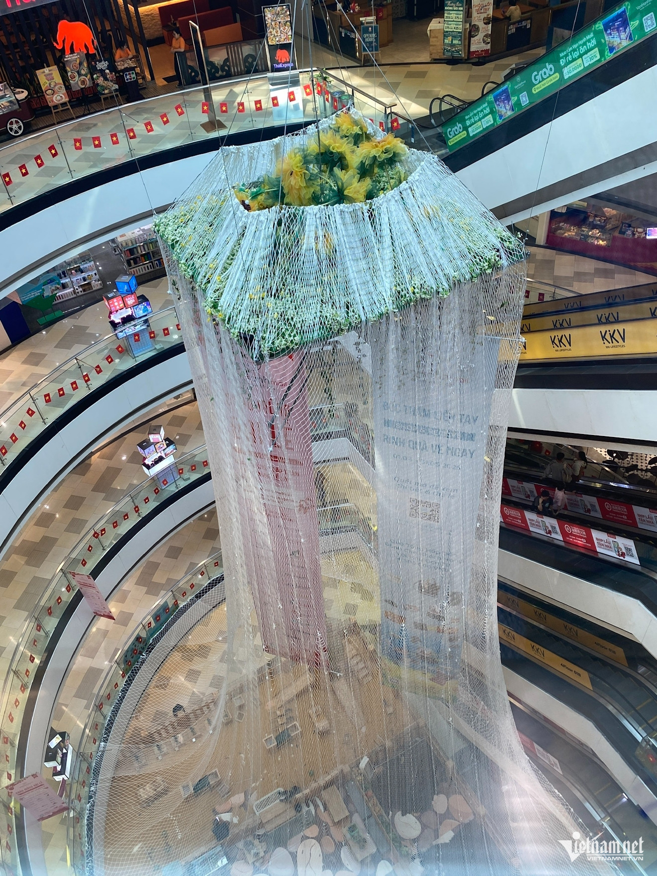 Lưới bảo vệ được lắp đặt theo hình nón cụt tại giếng trời Vạn Hạnh Mall. Ảnh: Tuấn Kiệt.