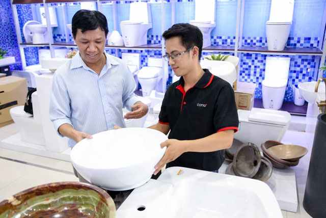 Anh Tài tự tay lựa chọn từng thiết bị phù hợp với diện tích, thiết kế và nhu cầu sử dụng của các thành viên gia đình cho căn phòng tắm mới tại showroom của nhãn hàng COTTO.