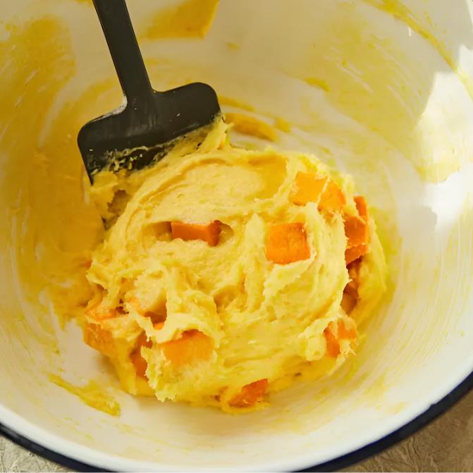 Bước 2: Cho bí đỏ vào hỗn hợp vừa trộn ở bước 1 và trộn bằng spatula. Bạn nhớ để lại một ít bí đỏ để trang trí trên cùng.