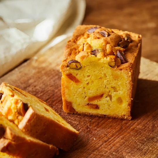 Bước 3: Đổ bột vào khuôn, sau đó cho bí đỏ và hạt dẻ cười lên trên. Vỗ mạnh khuôn xuống 3-4 lần để loại bỏ bọt khí và làm phẳng bề mặt.