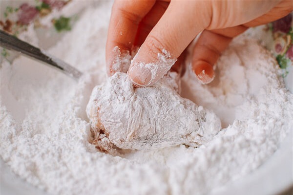 Trộn bột gạo và bột bắp cho thật đều. Sau đó lăn gà qua hỗn hợp bột.