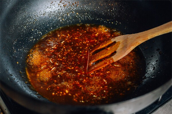 Làm nóng chảo. Chảo nóng cho 60 ml nước, 1/2 hỗn hợp nước mắm còn lại, ớt sa tế vào.