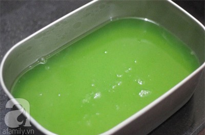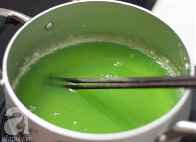 ![]() Khi bột thạch rau câu tan hết, bạn đổ từ từ 200ml nước cốt lá dứa vào nồi rau câu khuấy đều. |