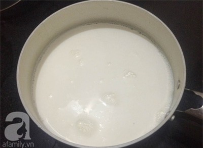 ![]() | ![]() Tiếp theo, bạn đổ 1 lít sữa tươi không đường vào nồi đun sôi lăn tăn thì tắt bếp. |