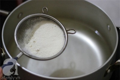 ![]() | ![]() Đổ 1 lít nước vào nồi đun sôi. Đổ bột rau câu vào rây, rắc nhẹ đồng thời khuấy đều tay để bột thạch rau câu không bị vón cục. |