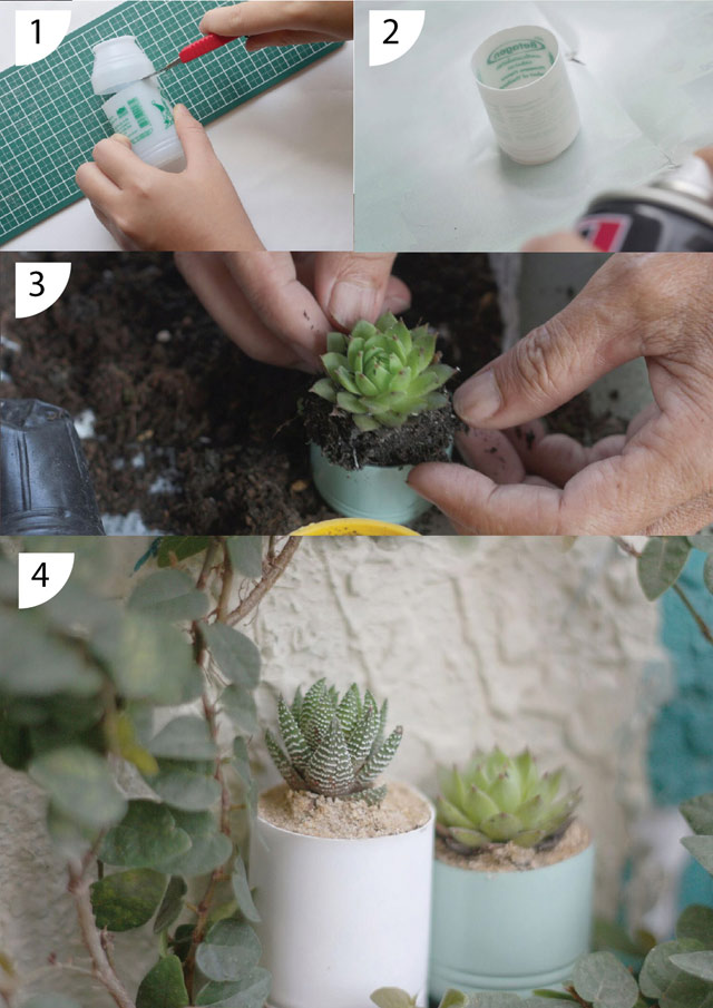 Thực hiện: Rửa sạch và lau khô chai sữa Betagen rồi cắt rời thân chai. Xịt sơn lên vỏ ngoài của phần chai vừa cắt. Chờ sơn khô và trồng xương rồng vào.