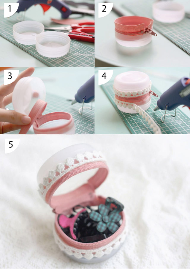 Thực hiện: Cắt lấy 2 đáy chai (cao khoảng 2 cm) rồi rửa sạch, lau khô. Cho đoạn dây kéo vào trong chai và cắt lại sao cho vừa với đường kính rồi dùng súng bắn keo cố định lại. Làm tương tự với phần nắp phía trên. Tiếp tục dùng súng bắn keo gắn đoạn ren lên mép ngoài của vỏ chai.