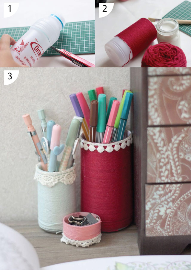 Thực hiện: Rửa sạch chai Betagen, lau khô, cắt bỏ phần đầu chai. Quét keo sữa lên toàn bộ mặt ngoài thân chai rồi quấn len kín thân chai. Phết keo lên miệng chai và gắn đoạn ren lên. Bạn có thể tùy ý chọn kích thước, màu sắc hay trang trí phụ kiện thêm lên thân lọ bút theo sở thích.