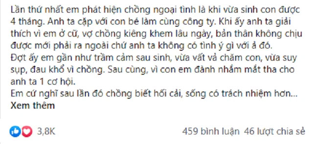 Đợt ấy em gần như trầm cảm sau sinh, vừa vất vả chăm con, vừa suy sụp, đau khổ vì chồng. Sau cùng, vì con em đành nhắm mắt tha cho anh ta 1 cơ hội.