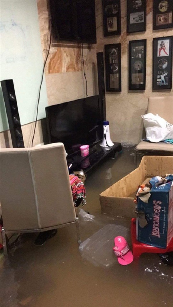 mưa tràn vào nhà Đàm Vĩnh Hưng đã khiến nhiều đồ đạc trôi ngổn ngang.