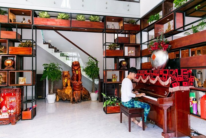 Bên cạnh cân đối màu sắc, việc chọn nội thất chủ yếu bằng gỗ cũng nhằm phù hợp với tín ngưỡng tâm linh của nam ca sĩ.