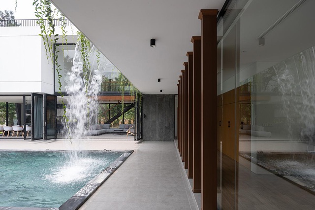 Điểm nhấn của khu vực căn biệt thự là một thác nước nhân tạo đổ xuống bể bơi, tạo ra cảnh quan ngoạn mục và sự khác biệt cho ngôi nhà. Ý tưởng tạo dòng thác táo bạo này sẽ vấp phải một số khó khăn về kỹ thuật, phương pháp xử lý chống thấm, nhưng các kiến trúc sư đã giải được bài toán, đem lại sự riêng biệt cho căn biệt thự. Thác nước được điều chỉnh hoạt động tùy theo ý muốn chủ nhà.
