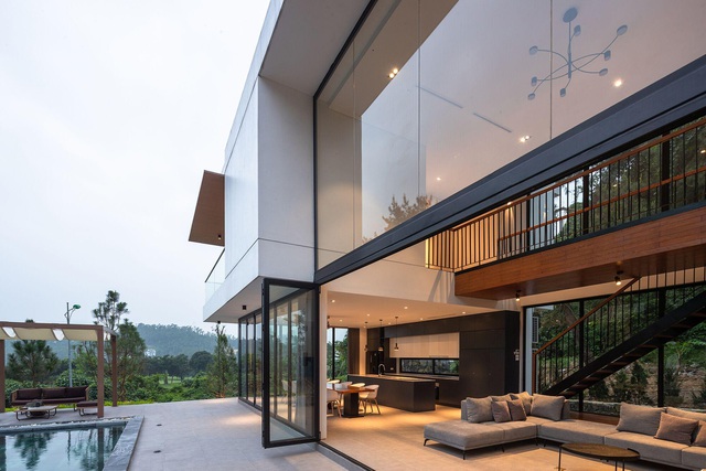 Bố cục của ngôi nhà cho phép bố trí hệ thống cửa kính lớn hiện đại, có thể mở bung ra để không gian trong - ngoài kết nối một cách tự nhiên.