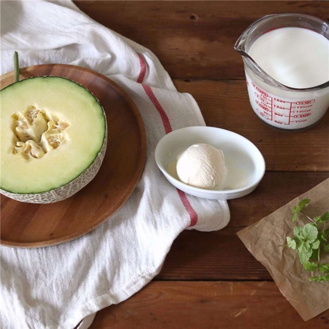 Cho phần sữa ở trên vào vỏ của quả dưa lưới đã nạo hết ruột. Lần lượt xếp các viên dưa lưới vào xung quanh.