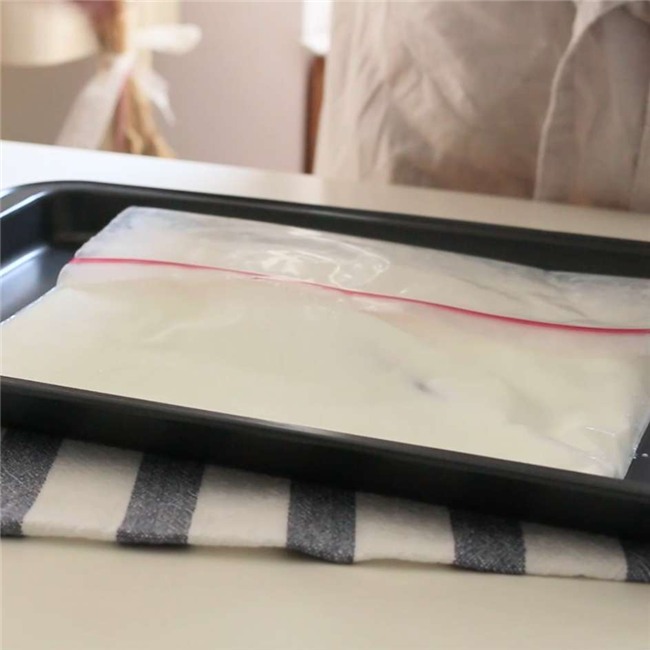 Trộn đều sữa đặc và sữa tươi rồi cho vào một chiếc túi zip. Dàn phẳng phần sữa sau đó để vào ngăn đá tủ lạnh 3 giờ.