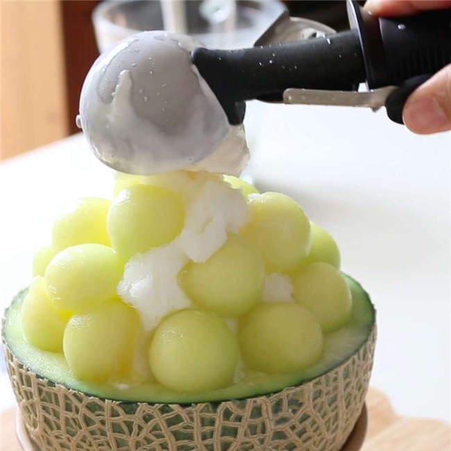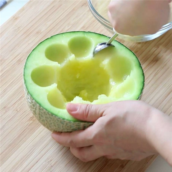 Nạo bỏ phần hạt. Dùng thìa múc để tạo thành những viên dưa lưới có dạng hình cầu.