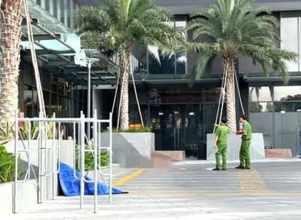 Nạn nhân sau khi rơi từ tầng 23 đã đập vào mái che trước khi tiếp đất. Phần mái che bằng kính cường lực bị biến dạng nặng, có dấu hiệu va đập.
