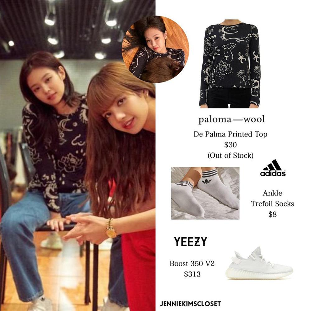 Jennie diện áo thun dài tay in họa tiết mix cùng quần jeans đơn giản, đi giày thể thao. Bộ cánh của cô có giá khá khiêm tốn, chỉ khoảng 8 triệu đồng.