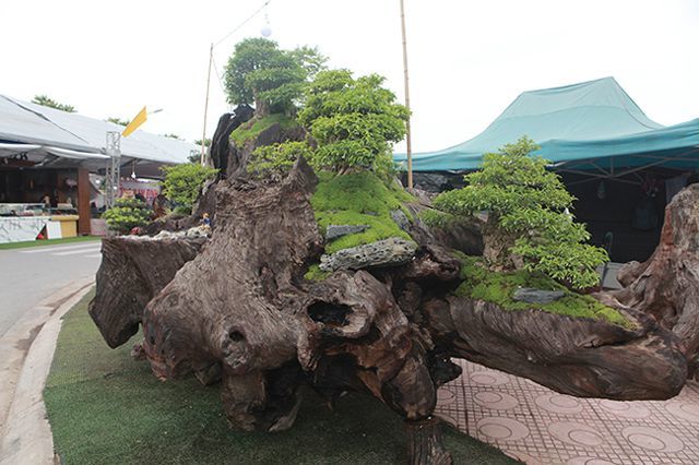 Bộ tiểu cảnh mai chiếu thủy tọa trên thân gỗ lũa sao đen liền khối của anh Trịnh Ngọc Cường đến từ Nha Trang (Khánh Hòa) được nhiều người dân, giới chơi cây cảnh chú ý. Tác phẩm hiện đang được chào bán tại hội chợ cây cảnh Long Biên (Hà Nội).