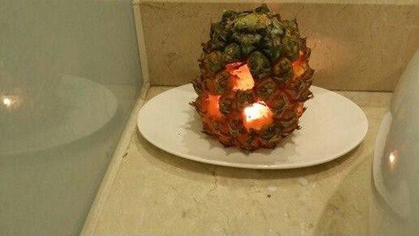 Cách làm: Quả dứa không cần gọt vỏ, chỉ cần cắt ngang 2 đầu, khoét, múc hết phần ruột vàng bên trong ra. Sau đó, lấy một cây nến đặt vào bên trong quả dứa. Lưu ý là toàn bộ cây nến phải bên trong trái và nên chọn loại nến làm từ sáp ong, tránh mua nến thơm hay nến không mùi làm từ paraffin vì không tốt cho sức khỏe.