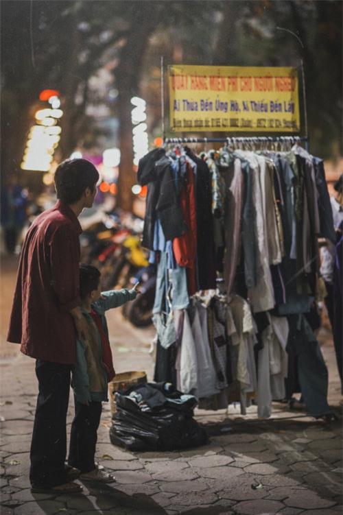 Tình cờ, cha con họ bắt gặp quầy quần áo miễn phí dành cho người nghèo