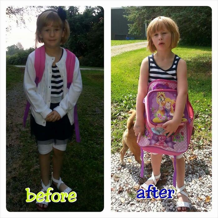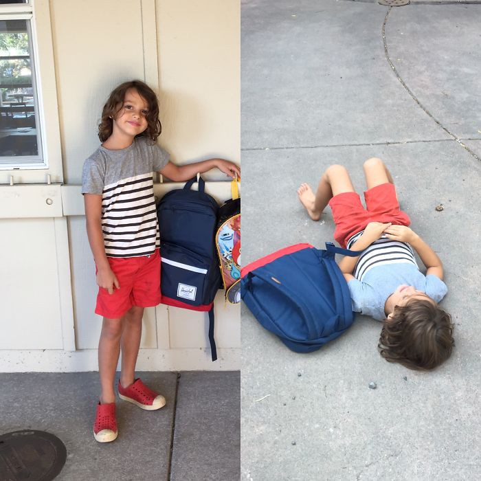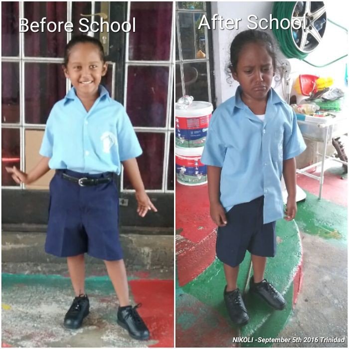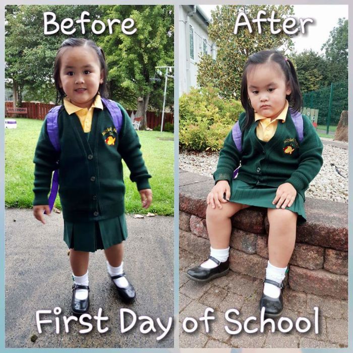 Sáng dậy quần áo tinh tươm, háo hức đến trường. Tuy nhiên sau ngày đầu tiên thì ai cũng tả tơi vì chưa quen với việc phải lao vào guồng quay học hành.