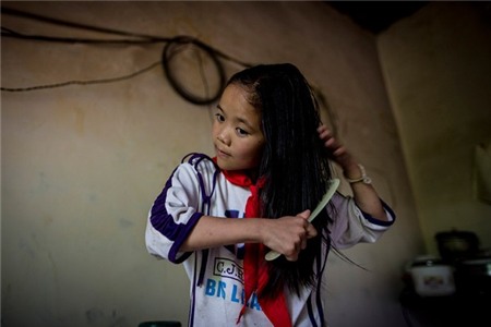 Liyan đang chải tóc. Hàng ngày, em thức dậy thật sớm để làm bữa sáng cho cha.