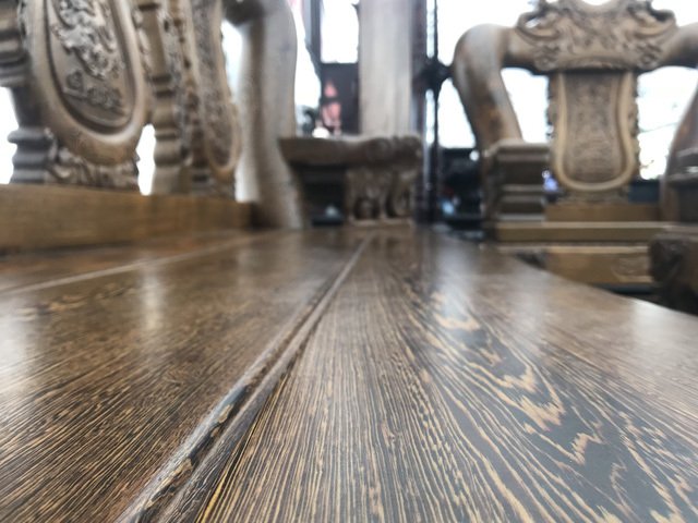 Toàn bộ số gỗ này được nhập khẩu từ Nam Phi, nhưng anh Tới cho biết: “Bộ bàn ghế này không phải muốn là làm được, vì nó cần rất nhiều gỗ. Số gỗ để làm bộ quốc voi này tôi mua từ 2 năm trước. Thời điểm đó, gỗ có thể nhập được nhiều, giá lại rẻ nên mới dám làm.”